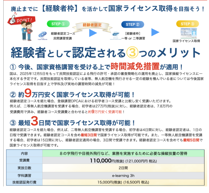 日数 4日間:国交省HP掲載の講習団体が発行したライセンス所持者の方または無人ヘリライセンス所持者の方(DPCAフライトオペレータ技能証)